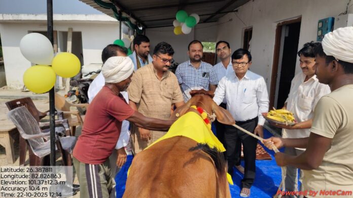 बुधवार को रामनगर विकास खण्ड के कसदहां ग्राम पंचायत में स्थित अस्थाई पशुआश्रित गौशाला पर वैदिक मन्त्रोंच्चारण के बीच विधि पूर्वक गोवर्धन दिवस के अवसर पर गौ माता का पूजन अर्चन किया गया। उक्त अवसर पर मुख्य अतिथि के रूप में हिन्दू युवा वाहिनी के प्रदेश कार्य समिति सदस्य अनिल सिंह रहे, गौ सेवा को सर्वोपरि बताया उन्होंने कहा सनातन धर्म में गंगा गौ, गीता ही हमें हर बाधाओं से सुरक्षित रखता है गौ सेवा से कोई भी वैतरणी पार कर सकता है गाय हमारे यहां पूज्य है इनमें सभी देवताओं का वास है। उक्त अवसर पर खण्ड विकास अधिकारी जगन्नाथ चौधरी, डा विवेक सिंह, कसदहा ग्राम प्रधान प्रतिनिधि राम नारायण यादव, ग्राम विकास अधिकारी चंद्रभान यादव, इन्द्रजीत यादव रामप्रसाद आदि ने गौ माता को गुड एवं फल खिला कर पूजन किये । हि यु वा नेता अनिल सिंह नें कहा की यह पूजा अहंकार पर भक्ति और प्रकृति की शक्ति के विजय का प्रतीक है।आज के ही दिन भगवान कृष्ण ने बृजवासियो की रक्षा के लिए इंद्रदेव के अहंकार को समाप्त किया था और गोवर्धन की छांव से सभी गोवंश व ग्वालों की रक्षा की थी ,तबसे यह परम्परा चली आ रही है कार्यक्रम का शुभारम्भ पं सुधीर त्रिपाठी ने कराया ।