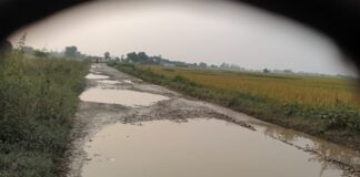 सडक पर हुए बड़े बड़े गड्ढे ,पैर से घूटने तक पूरा...