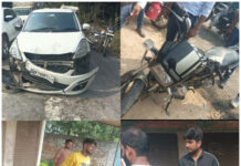 बाइक और कार में हुई भीषण टक्कर बाल बाल बची जान