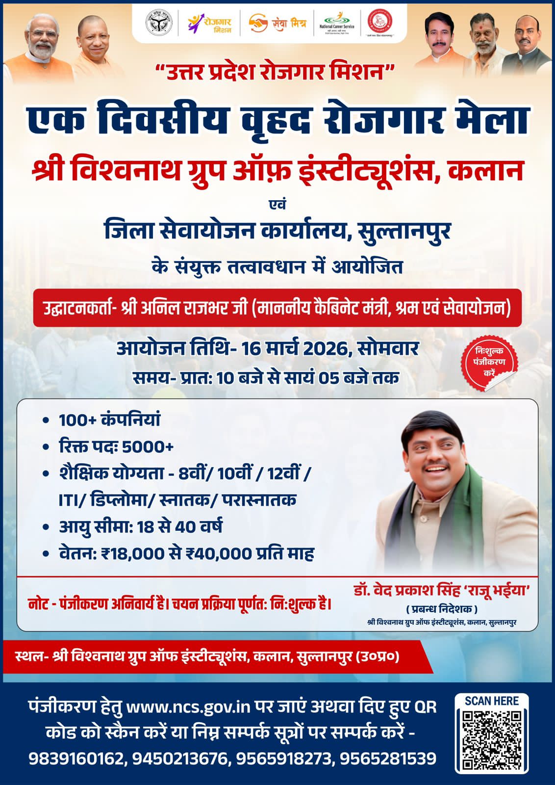 जिले के युवाओं को रोजगार के अवसर उपलब्ध कराने के उद्देश्य से श्री विश्वनाथ ग्रुप ऑफ इंस्टीट्यूशंस कलान और जिला सेवायोजन कार्यालय सुल्तानपुर के संयुक्त तत्वावधान में 16 मार्च को वृहद रोजगार मेले का आयोजन किया जाएगा। यह मेला श्री विश्वनाथ पीजी कॉलेज कलान परिसर में सुबह 10 बजे से शाम 5 बजे तक आयोजित होगा।संस्थान के प्रबंध निदेशक डॉ.वेद प्रकाश सिंह ने बताया कि मेले में 100 से अधिक प्रतिष्ठित कंपनियां भाग लेंगी और करीब 5000 से अधिक रिक्त पदों पर भर्ती की जाएगी।उन्होंने युवाओं से अधिक से अधिक संख्या में रोजगार मेले में पहुंचकर अवसर का लाभ उठाने की अपील की है।रोजगार मेले में 8वीं, 10वीं, 12वीं पास, आईटीआई, डिप्लोमा, स्नातक और परास्नातक तक की शैक्षिक योग्यता वाले अभ्यर्थी प्रतिभाग कर सकते हैं।अभ्यर्थियों की आयु सीमा 18 से 40 वर्ष निर्धारित की गई है।चयनित अभ्यर्थियों को 18 हजार से 40 हजार रुपये प्रतिमाह तक वेतन मिलने की संभावना है। मेले में प्रतिभाग और चयन प्रक्रिया पूरी तरह निःशुल्क होगी।अभ्यर्थियों से अनुरोध किया गया है कि वे अपने सभी शैक्षिकप्रमाणपत्र,पहचान पत्र,बायोडाटा और अन्य आवश्यक दस्तावेजों की मूल प्रति व फोटोकॉपी साथ लेकर मेले में पहुंचें।