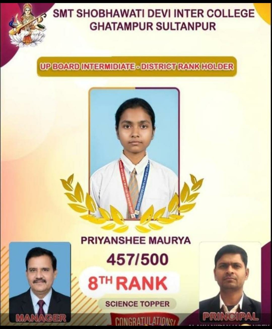 उत्तर प्रदेश माध्यमिक शिक्षा बोर्ड के परिणाम घोषित होने पर शोभावती देवी इंटर मीडियट कॉलेज घाटमपुर सुल्तानपुर की कक्षा 12 की छात्रा प्रियांशी मौर्य पुत्री राजेश मौर्या निवासी ग्राम बरामदपुर पोस्ट मखदुमपुर जिला सुल्तानपुर गांव की बेटी ने माध्यमिक शिक्षा शिक्षा परिषद उत्तर प्रदेश की परीक्षा उत्तीर्ण कर जिले में टॉप टेन में अपना नाम दर्ज कराया जिसकी जानकारी मिलते ही श्री मती शोभावती देवी इंटर कॉलेज घाटमपुर सुल्तानपुर के प्रबंध डॉ जे पी दुबे, प्रधानाचार्य श्री अलख निरंजन पाण्डेय एवं समस्त गुरुजनों ने प्रियांशी फोन करके बधाई दी और प्रियांशी मौर्य की उज्जवल भविष्य की कामना की,जिले में आठवां स्थान प्राप्त किया और कॉलेज में टॉप किया ।
