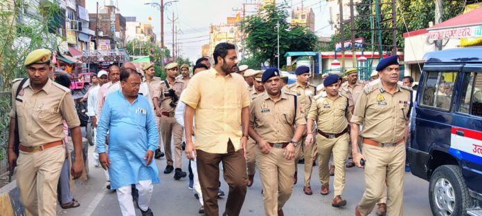 नगर में रूट मार्च कर लोगों को जागरूक करते दिखे आईजी प्रवीण कुमार।