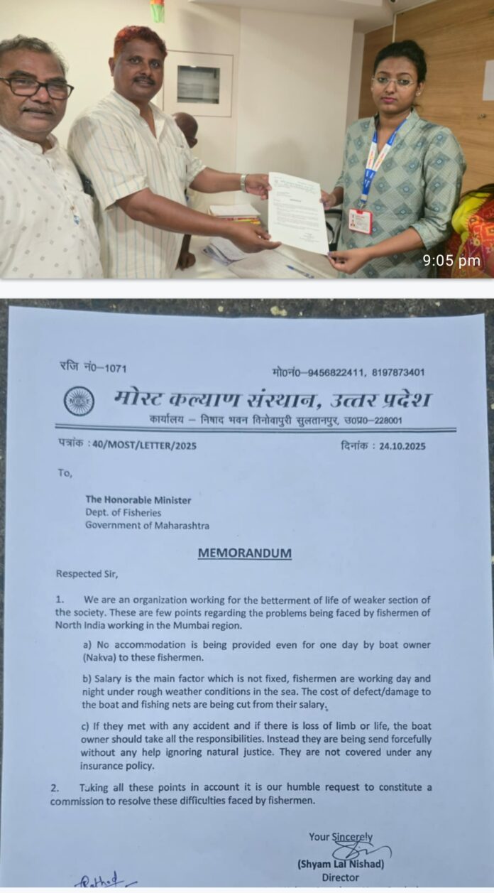दिनांक 24.10.2025 को समुद्र में मछली पकड़ने वाले उत्तर भारतीय मछुआरों को जोखिम पूर्ण सुरक्षा शर्तों के दायरे में रखने व उनके सुरक्षा संरक्षण व शोषण मुक्त सुनिश्चित कराने के लिए मोस्ट के लोगों द्वारा गेटवे ऑफ इंडिया से मंत्रालय तक पद यात्रा कर मत्स्य पालन विभाग महाराष्ट्र सरकार के मंत्री को मोस्ट डायरेक्टर निलंबित शिक्षक श्यामलाल निषाद “गुरूजी” के नेतृत्व में ज्ञापन दिया गया।