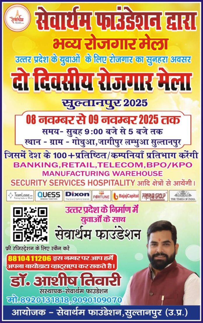 सुल्तानपुर जिले के लंभुआ तहसील क्षेत्र के गोथूआ जागीपुर गांव में दिनांक 08 व 09 नवम्बर यानी शनिवार व रविवार को सेवार्थम फाउंडेशन के बैनर तले दो दिवसीय रोजगार मेले का आयोजन किया जा रहा है । रोजगार मेले में देश की नामी गिरामी कम्पनियां शामिल है ।जिले के युवाओं को उनकी योग्यता अनुसार रोजगार दिलाने के लिए डॉ आशीष तिवारी ने पहल की है । उन्होंने बताया कि जिले के बेरोजगार युवकों के लिए है सुनहरा अवसर। जिस किसी भाई बहन को रोजगार की तलाश है वो इस नंबर पर 8810411206 अपना बायोडाटा व्हाट्सएप कर सकते है । इस रोजगार मेले का आयोजन सेवार्थम फाउंडेशन द्वारा किया जा रहा है। इस मेले में 100 से अधिक नामी कंपनियां शामिल हो रही हैं।