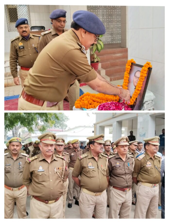 गाजीपुर/जनपद के पुलिस अधीक्षक ओमवीर सिंह की अध्यक्षता में 6 दिसंबर को देश के संविधान निर्माता, प्रथम कानून मंत्री बाबा साहब डॉक्टर भीमराव अंबेडकर की पुण्यतिथि के अवसर पर पुलिस अधीक्षक कार्यालय गाजीपुर में, पुलिस अधीक्षक द्वारा बाबा साहब के चित्र पर माल्यार्पण कर पुष्पांजलि की गई तथा देश के लिए उनके योगदान को याद किया गया। इस अवसर पर अपर पुलिस अधीक्षक नगर, ग्रामीण, व क्षेत्राधिकारी नगर के साथ साथ पुलिस विभाग के अन्य अधिकारीयों एवं कर्मचारियों द्वारा भी माल्यार्पण कर पुष्पांजलि की गई।