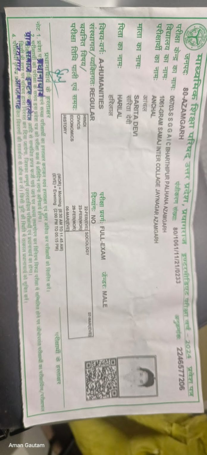 मेहनगर /आजमगढ़: हरिलाल पुत्री आंचल गजोर की निवासी है आंचल ग्राम समाज इंटर कॉलेज जयनगर इंटर कॉलेज में पढ़ती है जब वह अपने परीक्षा का प्रवेश पत्र लेने के लिए विद्यालय पर पहुंची तो उसे विद्यालय पर प्रवेश पत्र मिला प्रवेश पत्र देते समय विद्यालय के किसी अध्यापक ने नहीं देखा कि आंचल का जेंडर बदल गया है आंचल जब अपना प्रवेश पत्र लेकर घर आई तो देखा उस पर उसका जेंडर महिला के जगह पुरुष हो गया है इसका सुधार करवाने के लिए जब विद्यालय पर गयी तो अध्यापकों द्वारा बताया गया कि इसका कोई सुधार नहीं किया जा सकता है अब आपको इसी तरह पेपर देना पड़ेगा जब की इस बात से आंचल बहुत परेशान है कि उसके विद्यालय के सभी लड़कियों का सेल्फ सेंटर है वह केवल अकेले ही श्री संपत ग्रामीण ज्ञानस्थली इंटर कॉलेज भारतीपुर पल्हना आजमगढ़ इतने लड़कों के बीच में एक आंचल ही पेपर देगी उसके परिजनों द्वारा विद्यालय मैनेजमेंट यूनिवर्सिटी पर आरोप लगाया जा रहा है कि कितने लड़कों के बीच में एक लड़की पेपर देगी इसमें उसका मानसिक संतुलन ठीक नहीं रहेगा उसको इस बात का डर हमेशा बना रहेगा की ईतने लड़कों के बीच में मैं अकेली हूं जिससे वह पेपर में क्या लिखेगी यदि वह फेल होती है तो उसके फेल होने का जिम्मेदार विद्यालय मैनेजमेंट और माध्यमिक शिक्षा परिषद उत्तर प्रदेश प्रयागराज दोषी है क्योंकि अभी अभी उत्तर प्रदेश पुलिस प्रवेश पत्र में एक लड़के के प्रवेश पत्र का नक्शा ही बदल गया उस लड़के का कहना था कि जब मैं आवेदन करवाने के लिए गया था यूपी पुलिस की तो आवेदन सही तरीके से किया गया था और मुझे उसका प्रिंट पेपर मिला था लेकिन जब उसका एडमिट कार्ड निकाला गया तो उसके एडमिट कार्ड का नक्शा ही बदल गया था उसके एडमिट कार्ड पर अभिनेत्री सनी लियोनी का पूरा बायोडाटा छप गया और वह लड़का परीक्षा से वंचित रह गया ठीक इसी तरह आंचल के साथ जेंडर परिवर्तन होने के वजह से उसके परीक्षा पीरियड में काफी समस्या का उसको सामना करना पड़ेगा ऐसी स्थिति में इसका जिम्मेदार कौन है