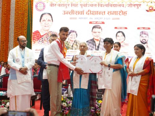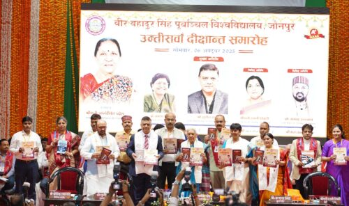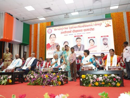जौनपुर – वीर बहादुर सिंह पूर्वांचल विश्वविद्यालय का 29 वें दीक्षांत समारोह सोमवार कोमहंत अवेद्यनाथ संगोष्ठी भवन में संपन्न हुआ। इस अवसर पर माननीय कुलाधिपति एवं श्रीराज्यपाल उत्तर प्रदेश श्रीमती आनंदीबेन पटेल ने सर्वोच्च अंक प्राप्त करने वाले स्नातकएवं स्नातकोत्तर के79 मेधावियों को 80 स्वर्णपदक प्रदान किया। साथ ही 445 शोधार्थियों को पी.एचडी.और दो को डीलिट की उपाधि दीगई । इस वर्ष विभिन्न पाठ्यक्रमों में स्नातक औरपरास्नातक के 80141 विद्यार्थियों को डिग्री प्रदान की गई।कुलाधिपति जी ने दीक्षांत समारोह के मुख्य अतिथि सुनीलदत्त को डी.एससी. की मानद उपाधि दी ।कुलाधिपति एवं उत्तर प्रदेश की माननीयराज्यपाल श्रीमती आनंदीबेन पटेल ने कहा कि शिक्षा तभी सार्थक होती है जबविद्यार्थी गुरु के पास बैठकर कक्षा में संवाद करें। इसी को ध्यान में रखते हुए 75 फीसदी उपस्थिति अनिवार्य की गई है और इसका कड़ाई से पालन विश्वविद्यालयोंको करना होगा। राज्यपाल ने शिक्षकों से आह्वान करते हुए कहा कि वे विद्यार्थियोंकी शिक्षा के साथ-साथ चरित्र निर्माण भी करें। उन्होंने कहा कि विश्वविद्यालयोंमें रिसर्च गंभीरता के साथ होना चाहिए क्योंकि रिसर्च ही देश और समाज के लिएउपयोगी होता है। इसके लिए शिक्षक और विद्यार्थी दोनों में जज्बा होना जरूरी है।गुजरात में इसरो का उदाहरण देते हुए राज्यपाल ने कहा कि प्राकृतिक आपदाओं से जानजा रही है, जिसमें खास तौर से आकाशीय बिजली का खतरा ज्यादारहा। इस बार इससे 85 लोगों की जान चली गई। इस पर गंभीरता केसाथ शोधकिया जा रहा है कि कैसे मानव और जीव की सुरक्षा की जा सकती है। उन्होंने कहा कि हमारे पास पुरातन ज्ञान हैअसंख्य पांडुलिपियां हैं और आयुर्वेद मेंजिन औषधियों का जिक्र हैं, इस पर काम करने की जरुरतहै। प्रधानमंत्री माननीय नरेंद्र मोदी ने इसी पर शोध करने की पहल की है ताकि समाजतक इसका लाभ पहुंच सके। राज्यपाल ने कहा कि विश्वविद्यालयों के बीच एमओयू करने कामकसद आपसी ज्ञान का आदान-प्रदान कर शोध और नवाचार को आगे बढ़ाना है। उन्होंने कहाकि 21वीं सदी का विद्यार्थी जब कहीं प्रवेश लेता है तो वहसंस्थान की नैक ग्रेडिंग, एनआईआरएफ रैंकिंग और प्लेसमेंट कोध्यान में रखकर प्रवेश लेता है, इसलिए हर विश्वविद्यालय कोअपनी गुणवत्ता पर ध्यान देना जरूरी है, तभी विद्यार्थी उनकेसंस्थान में आएंगे।
