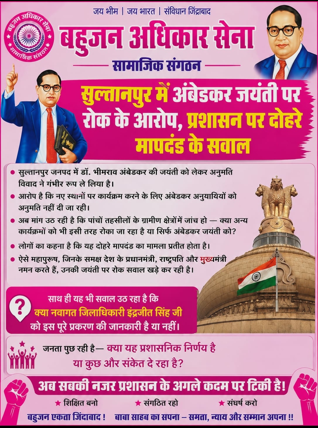 सुल्तानपुर जनपद में इस बार डॉ. भीमराव अंबेडकर जयंती को लेकर हालात सामान्य नहीं हैं। कार्यक्रमों की अनुमति को लेकर उठे सवाल अब खुलकर सामने आ रहे हैं। बहुजन अधिकार सेना समेत कई सामाजिक संगठनों का आरोप है कि आवेदन देने के बावजूद अनुमति नहीं मिल रही, जिससे लोगों में नाराजगी बढ़ती जा रही है।