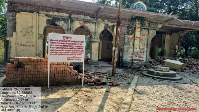 निजामाबाद/आजमगढ़। तहसील निजामाबाद के अन्तर्गत आने वाले ग्राम जगदीशपुर में धर्मशाला तोड़े जाने को लेकर हुए विवाद के मामले में ज्वाइंट मजिस्ट्रेट निजामाबाद ने विवादित स्थल पर नोटिस बोर्ड लगवा दिया है। SDM निजामाबाद सुनील कुमार धनवंता का कहना है कि यह जमीन सार्वजनिक है तथा पोखरे व भीटे के नाम पर दर्ज है। कुछ लोगों के द्वारा इस स्थल पर पूर्व में अवैध निर्माण करने का प्रयास किया गया था जिसके चलते यहां पर यह बोर्ड लगाया गया है। ऐसे में यदि कोई भी व्यक्ति इस स्थान पर निर्माण करता है तो उसके विरुद्ध कठोर कानूनी कार्यवाही किया जाएगा।